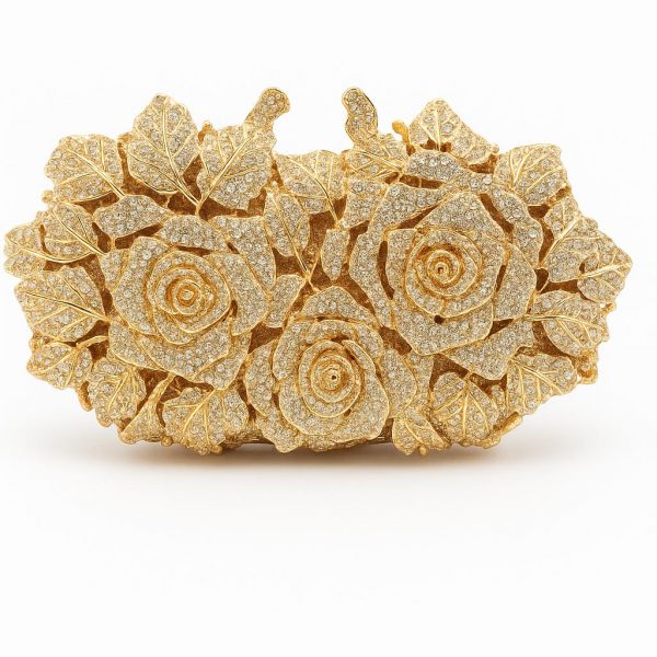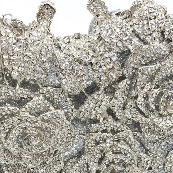 Elevate your evening ensemble with this exquisite crystal-studded clutch, designed in the shape of blooming roses. Crafted with meticulous attention to detail, each petal is encrusted with shimmering rhinestones for a dazzling effect that catches the light from every angle. The clutch features a compact interior perfect for your essentials, and comes with a sleek, detachable chain strap for versatile styling. Ideal for weddings, galas, or any glamorous occasion, this piece is both a fashion statement and a work of art