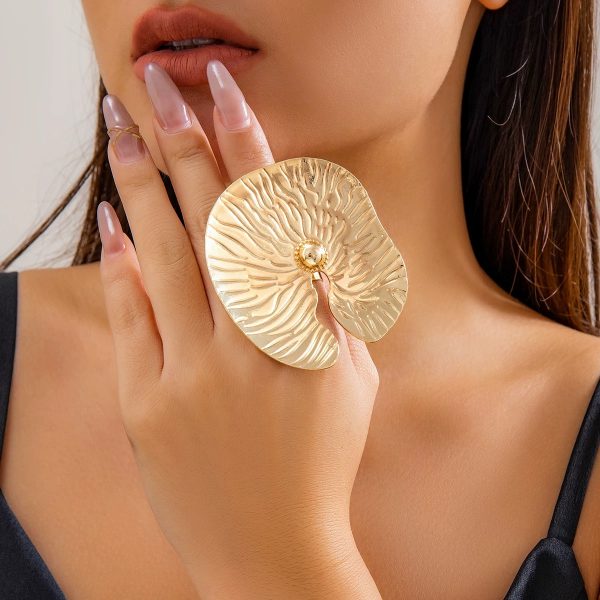 Make a bold statement with this stunning oversized gold statement ring. Featuring an abstract, sculptural design inspired by natural textures, this ring boasts a hammered finish that reflects light beautifully. Crafted in a luminous gold tone, the piece curves elegantly with a unique open center and radiating lines for a touch of artistic flair. Perfect for elevating any evening outfit or adding a dramatic twist to a minimalist look.