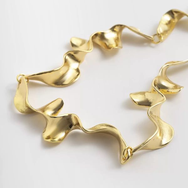 The Geometric Chunky Abstract Curved Ribbon Necklace offers an exclusive and alluring aesthetic. Meticulously constructed with precision and elegance, this necklace is an essential piece for any wardrobe.