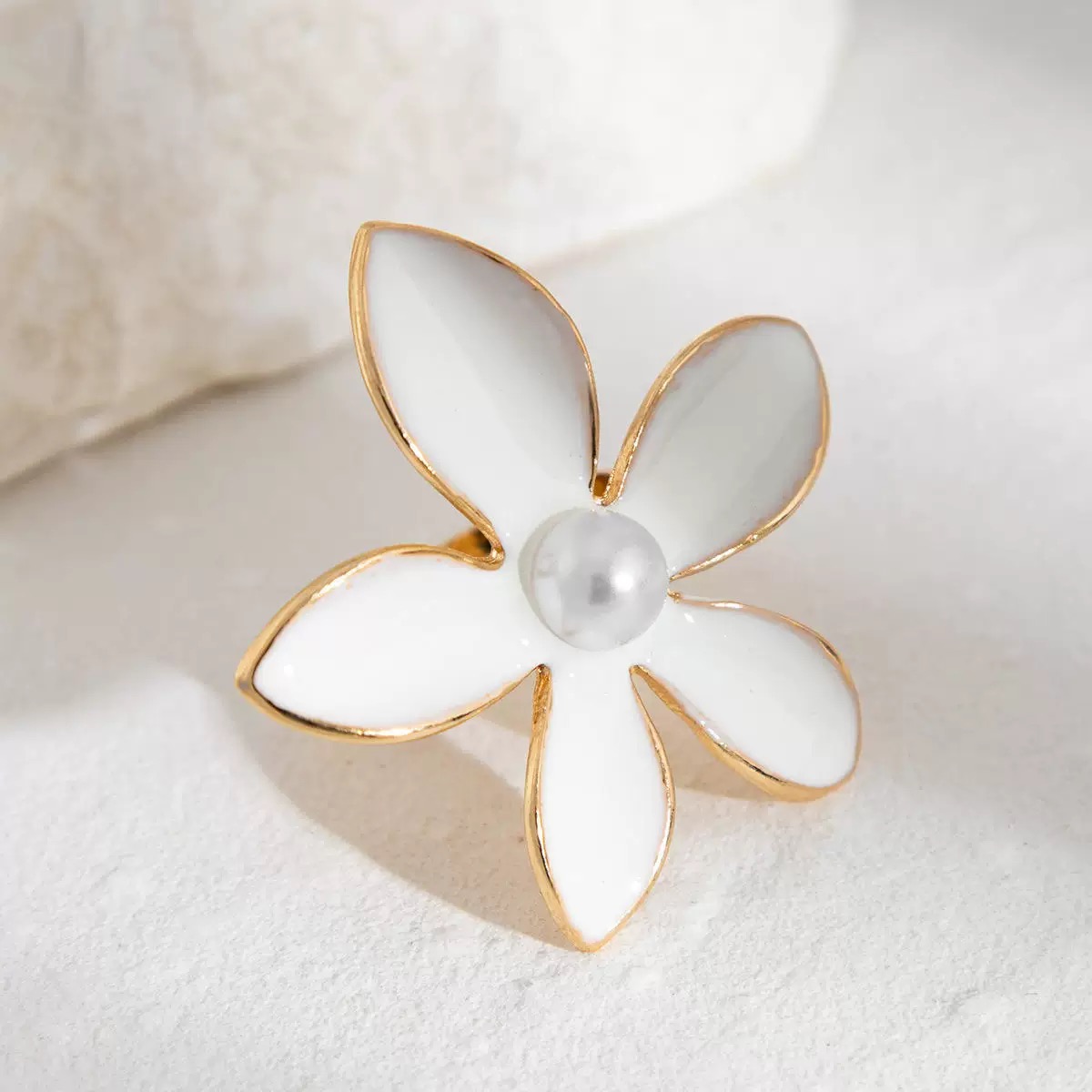 Add a touch of floral elegance to your ensemble with this stunning White Petal Flower Statement Ring. Crafted with delicately shaped enamel petals outlined in gold trim, the ring features a luminous pearl at its center, evoking timeless charm and sophistication. Designed to sit boldly on your finger, this piece is perfect for both everyday glam and special occasions.